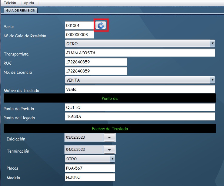 - De clic en la flecha seleccionada para que se cargue el secuencial de la guia, y proceda a llenar todos los datos;
