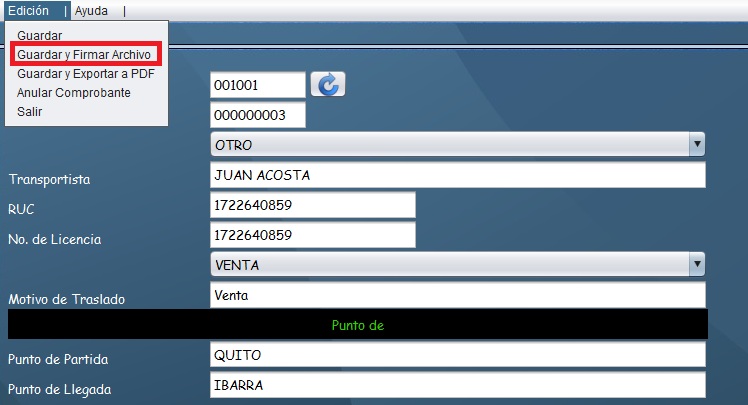- Una vez lleno todos los datos, clic en Edicion y Guardar y Firmar Archivo