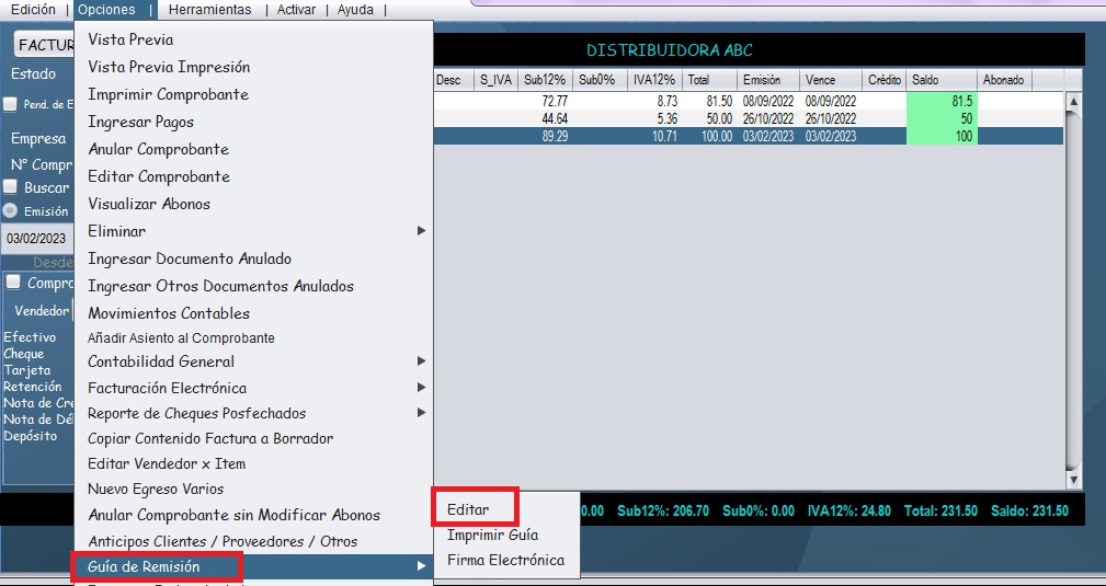 - Escoja la factura con la que va a emitir la guia de remisión, dirijase a Opciones, Guia de Remisión y Editar