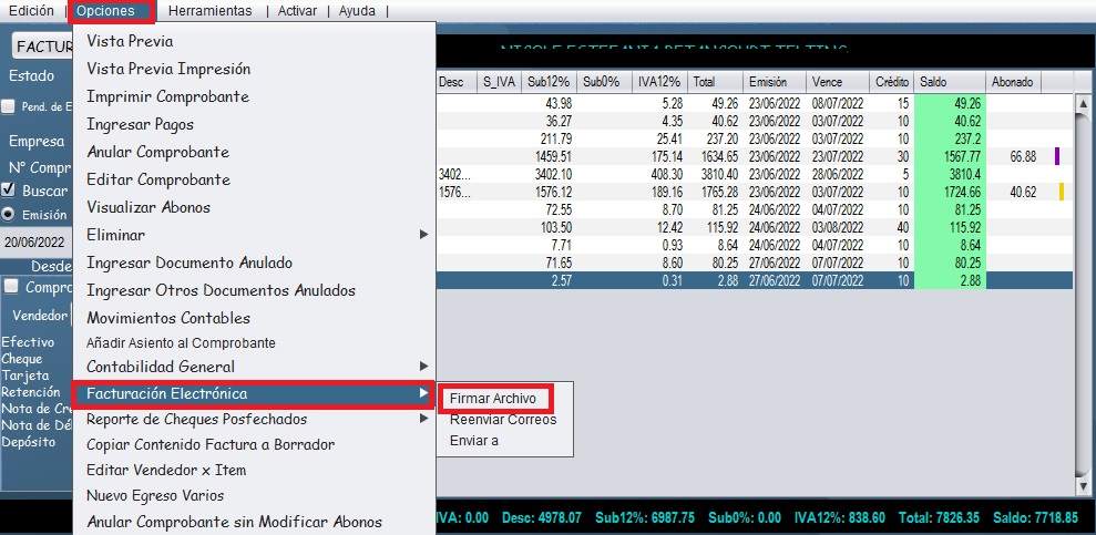 - Dir铆jase a la pesta帽a Opciones, selecciones Facturaci贸n Electr贸nica y luego Firmar archivo.