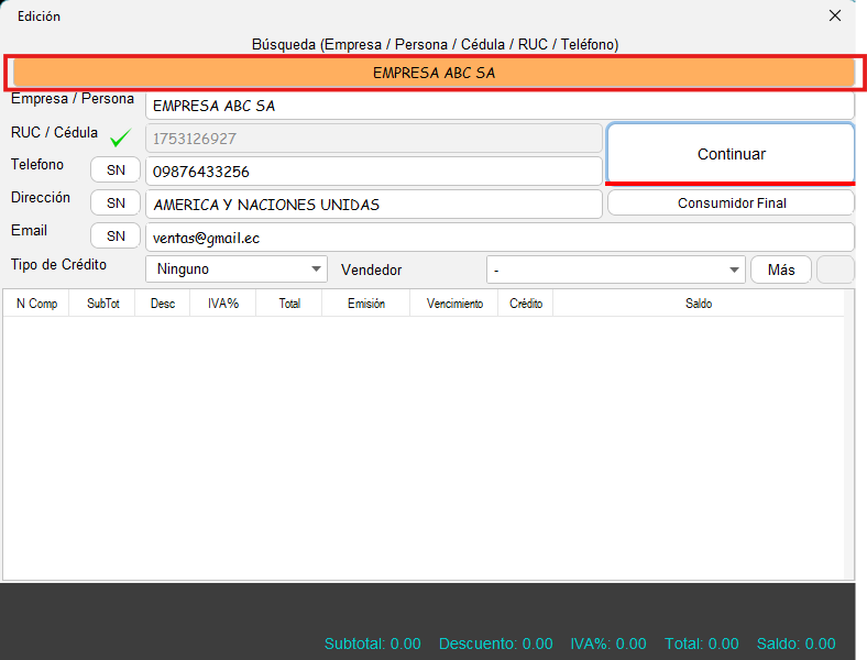 - Cuando estés en la pantalla, presiona la tecla F1, ingresa los datos del cliente al que se le realizará la proforma y presiona Continuar