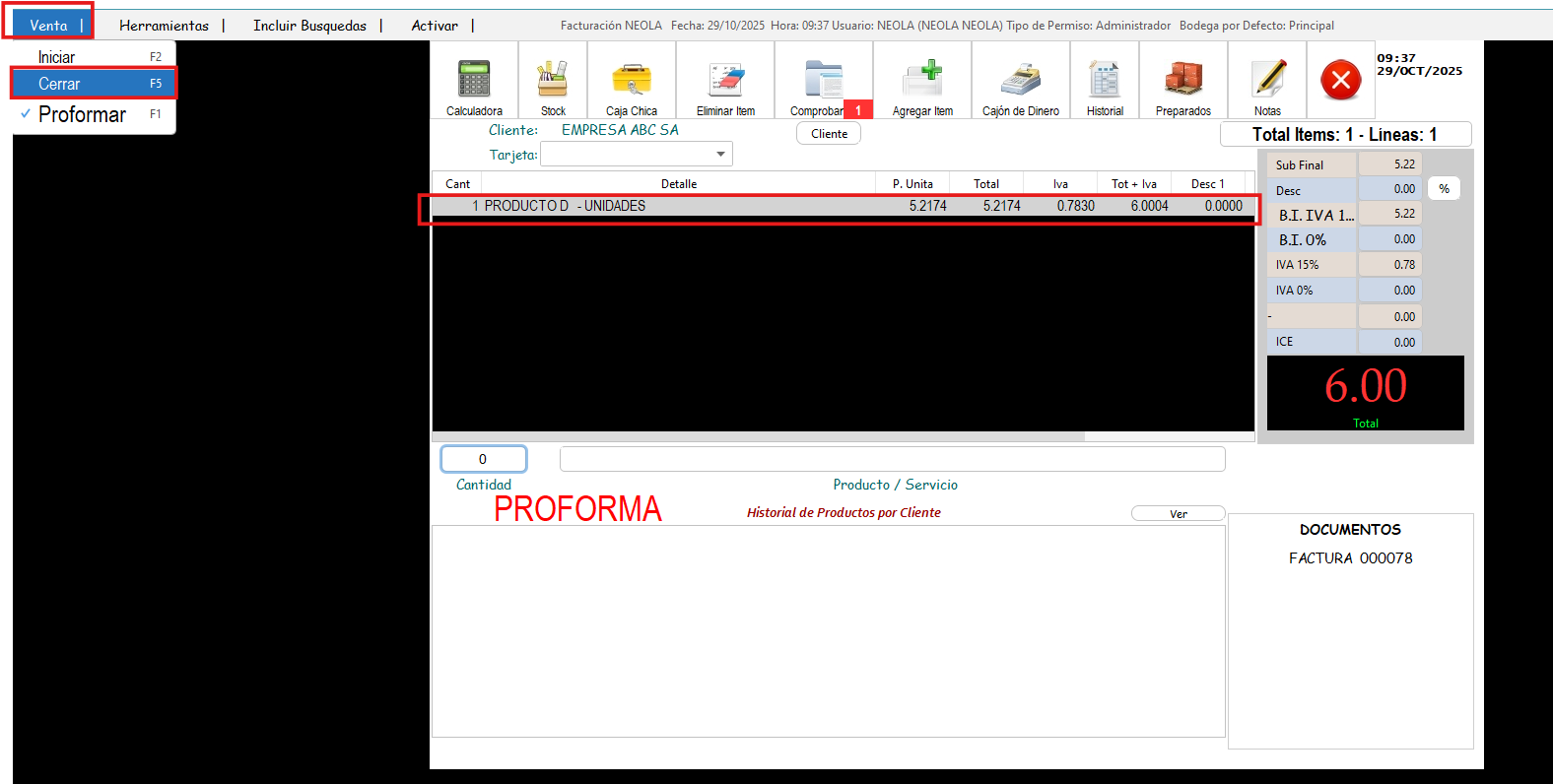 - Una vez ingresados los ítems, presiona le tecla F5 o dirígete a la pestaña Venta y clic en Cerrar.