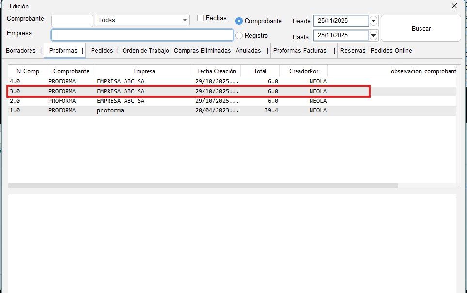 Busca y selecciona con doble clic la proforma que deseas modificar o convertir
