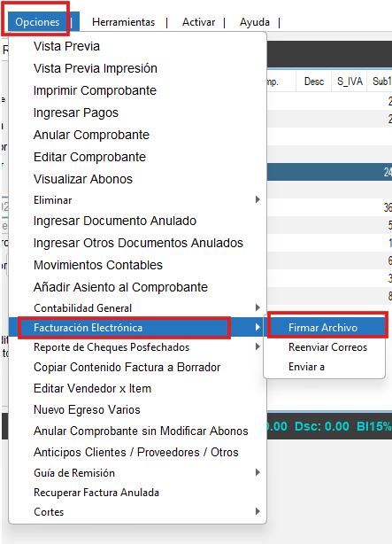 - Diríjase a la pestaña "Opciones" seleccione la opción de "Facturación Electrónica" y luego "Firmar Archivo"